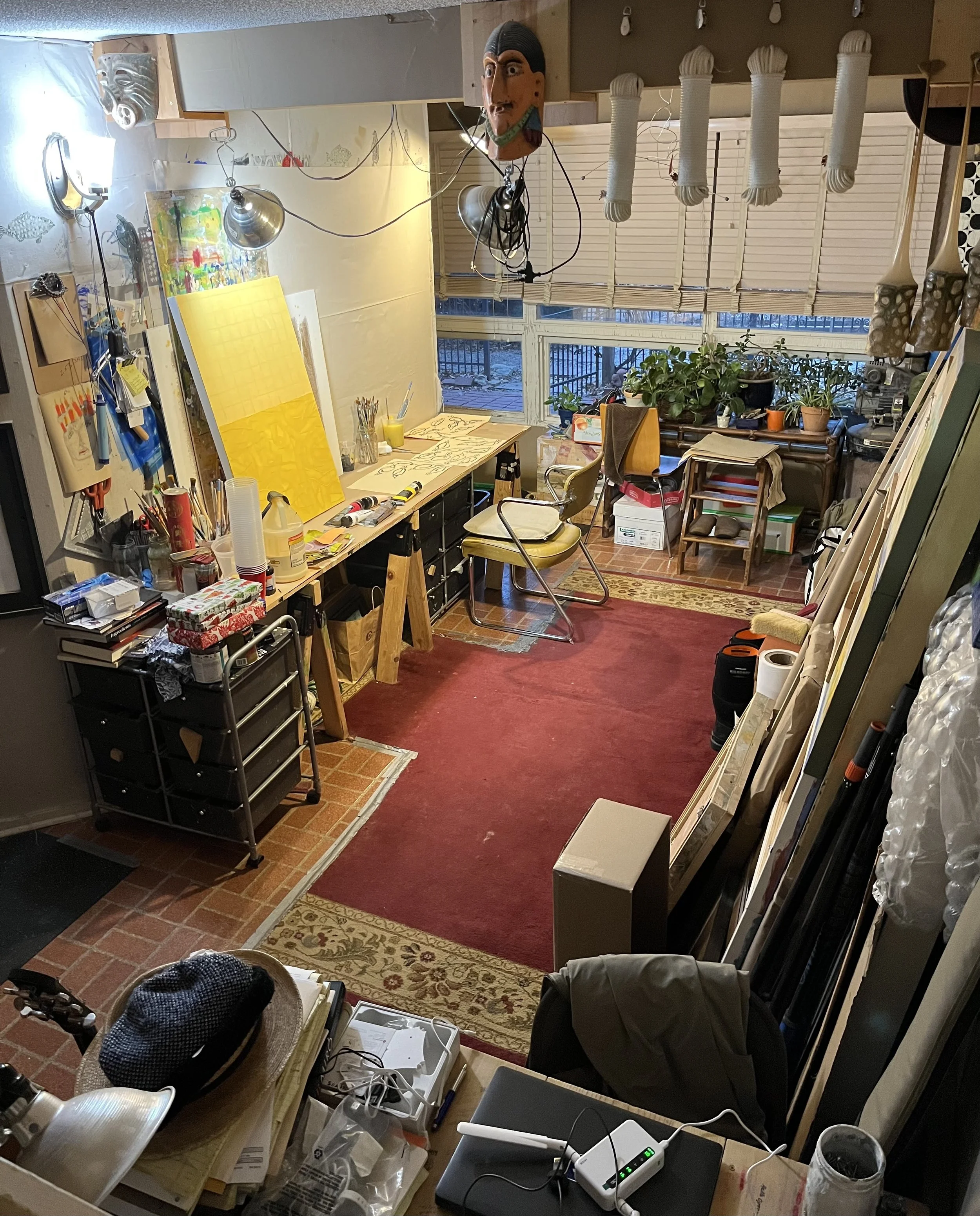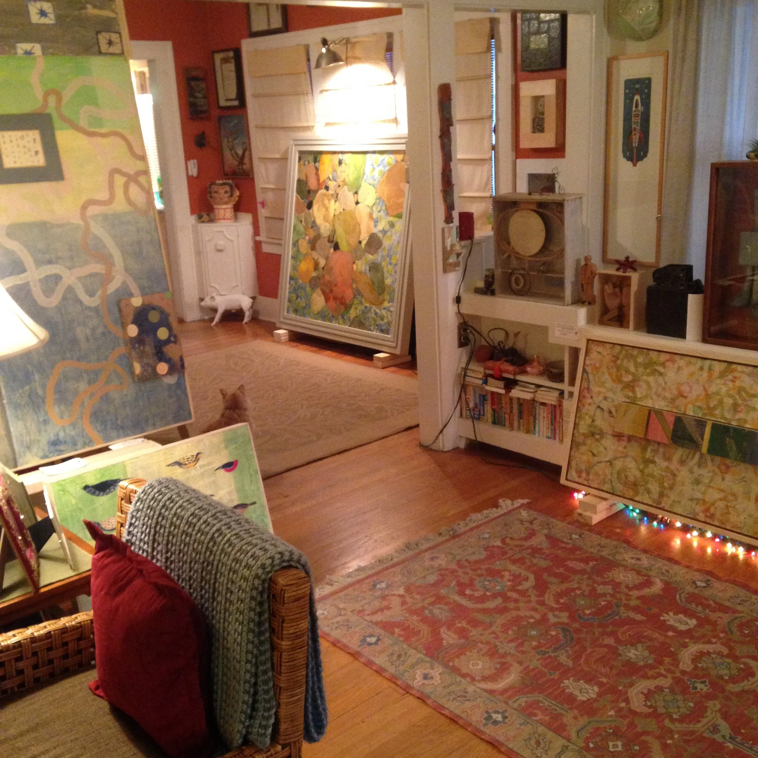 Clonts was an on-air commentator (“An Artist’s Perspective) for KMUW 89.1 FM, (Wichita NPR Affiliate). He is featured in the book “Wichita Artists In Their Studios” by Sondra Langel (published in 2016). His paintings are featured in prominent collections including Wichita Art Museum Permanent Collection, Emprise Bank Permanent Collection, MARKArts Permanent Collection, The Paula and Barry Downing Collection, and The Vantage Point Properties Collection. Clonts paints daily at his studio and home in the College Hill neighborhood of Wichita, Kansas, where he lives with his Wife, Taeko, two dogs (Stella and Charlie) and a cat (Reggie Bones). The house is frequently visited by five Granddaughters: Bela, Olive, Vada, Hazel, and Willow, plus, many other family members and great friends. It’s a boisterous place.